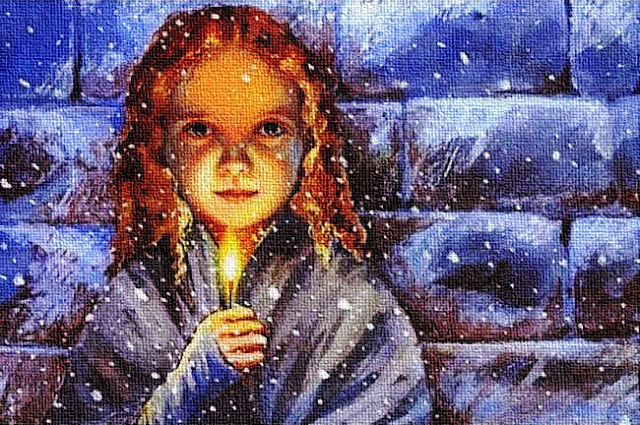 Đêm nay là đêm Giao Thừa, thế cho nên mọi gia đình trong khu phố đều chuẩn bị cho bữa ăn cuối năm trong khung cảnh ấm cúng của gia đình. Qua cửa sổ, những ngọn nến  sáng lấp lánh và mùi gà tây quay thơm phức của bữa tiệc cuối năm, thì bên ngoài đường, một bé gái đang bước đi run rẩy vì lạnh và đói dưới màn tuyết rơi phủ trắng trên những lọn tóc xoăn, trông thật thảm thương.