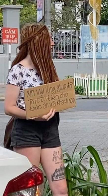 Cô gái Tây xin tiền với lý do bản thân cần chi phí để ăn và ở. (Ảnh: Bà Dì Nulo)