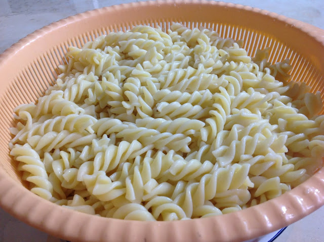 Macaroni luộc chín đổ ra rổ xả nước lạnh cho sạch hồ, để ráo.