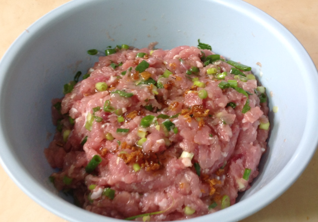 Ướp thịt xay với muối, tỏi phi, hành lá, trộn đều để cho thấm gia vị.