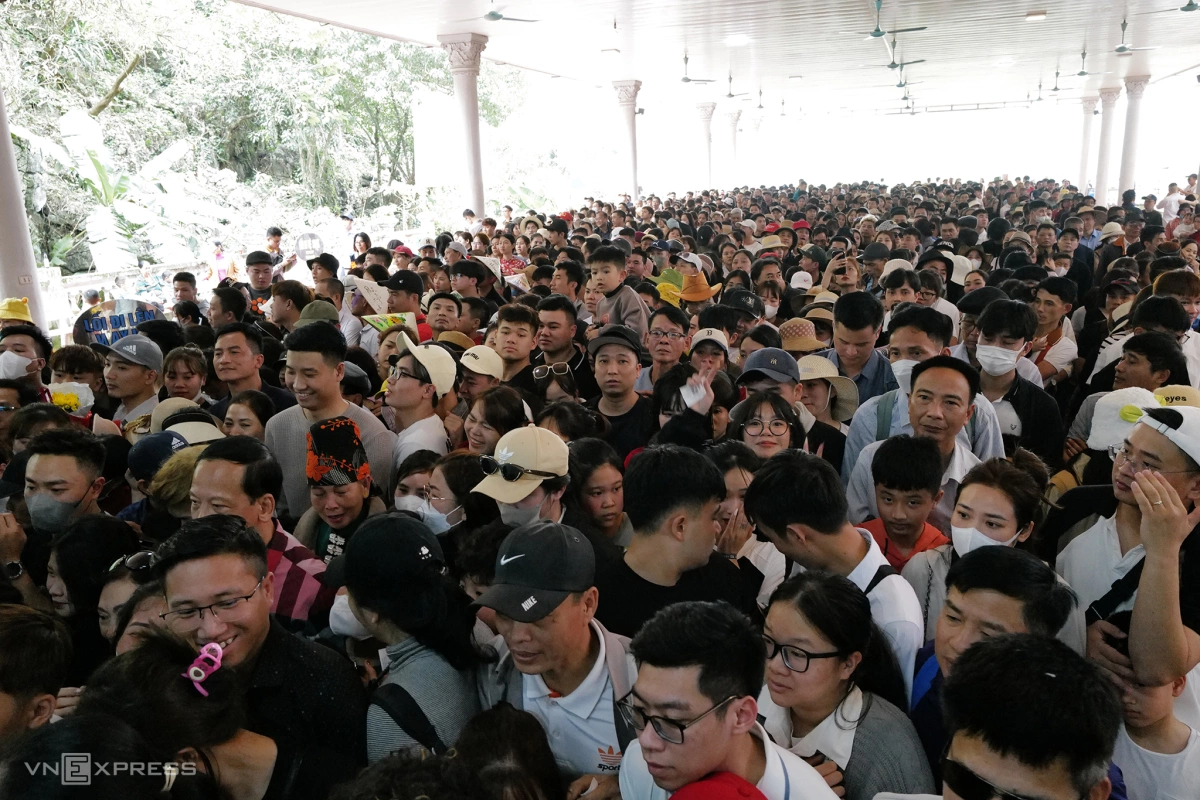Từ cáp treo vào cửa động Hương Tích chỉ khoảng 200 m nhưng để tới được đây, người dân phải đứng xếp hàng hơn một tiếng, nhích từng bước.